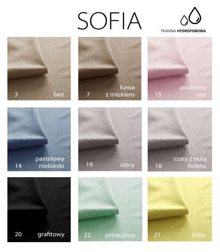 Welurowa gładka, miękka tkanina o właściwościach hydrofobowych z wyczuwalnym w dotyku meszkiem. Kolorystyka zawierająca modne pastelowe odcienie.