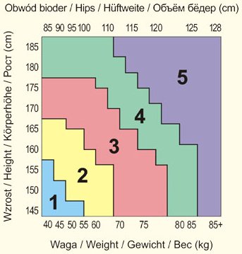 Przecięcie linii wagi i wzrostu wskazuje pole z właściwym rozmiarem.