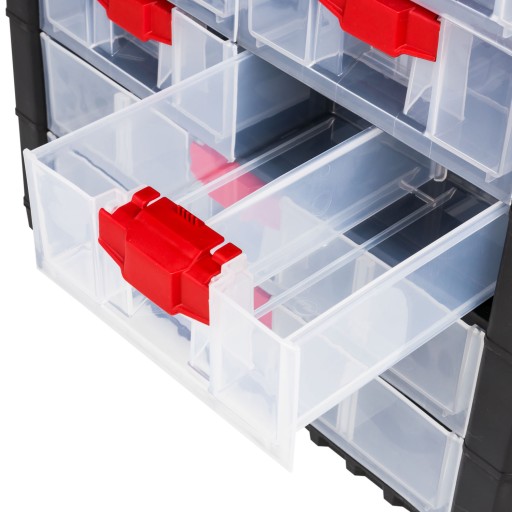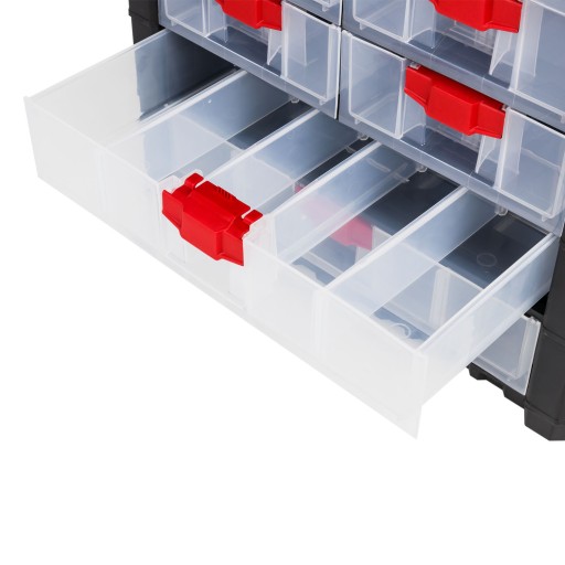 Organizer Multicase Cargo doskonale sprawdzi się w pracowni, magazynie czy warsztacie. Otwory w tylnej części obudowy skrzynki pozwalają na zawieszenie również na ścianie. NS501 wyposażony został w praktyczną rączkę do przenoszenia. W tym modelu znajdziemy: 3 małe, 4 średnie i 2 duże szufladki oraz praktyczny organizer.