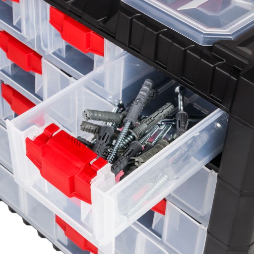 Organizer Multicase Cargo doskonale sprawdzi się w pracowni, magazynie czy warsztacie. Otwory w tylnej części obudowy skrzynki pozwalają na zawieszenie również na ścianie. NS303 wyposażony został w praktyczną rączkę do przenoszenia. W tym modelu znajdziemy:9 szufladek oraz przezroczysty organizer.
