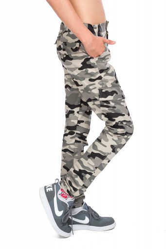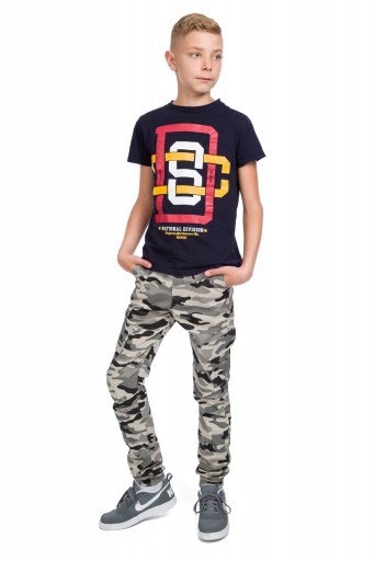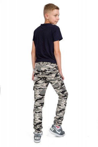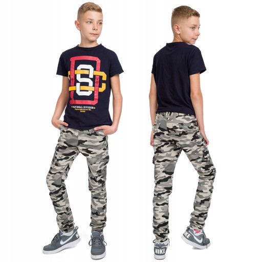 Modne spodnie chłopięce wzór moro. Posiadają kieszenie z przodu oraz na nogawkach, z tyłu atrapa. Typ bojówek, na dole nogawek wszyte gumki. W pasie guzik oraz zamek błyskawiczny, posiadają regulację w pasie (gumka z guzikiem) umożliwiającą idealne dopasowanie spodni.