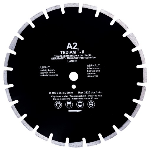 Tarcza diamentowa renomowanej marki TEDIAM model A2 to produkt profesjonalny, przeznaczony do wysokiej jakości głębokiego cięcia materiałów jak asfalt, jastrych, świeży beton, chodnik i innych.