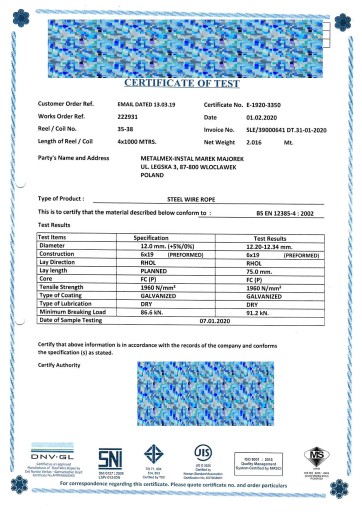 Liny posiadają atest producenta (jak na zdjęciu obok), co daje Tobie pewność iż zostały wykonane zgodnie z niemieckimi i europejskim normami DIN 3064, BS EN 12385-4:2002.