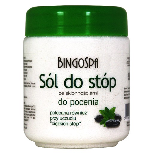 Sposób użycia: do naczynia z chłodną wodą wsypać dwie nakrętki soli BINGOSPA, dokładnie wymieszać, moczyć stopy przez co najmniej 15 minut, po skończeniu osuszyć. Czynność powtarzać codziennie przez 7-14 dni. Profilaktycznie moczyć stopy w upalne dni.