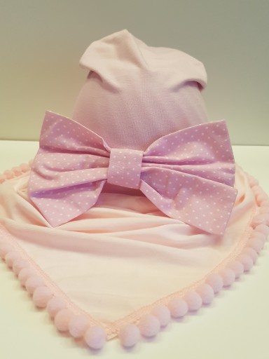 KOMPLET CZAPKA KOKARDA + CHUSTKA Z POMPONIKAMI CZAPECZKA CHUSTECZKA 3-12 MC