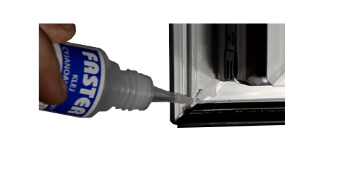 Uszczelkę w narożach przycinamy pod kątem 45 stopni i łączymy ze sobą. Do połączenie używamy kleju FASTER. Kilka kropel klej FASTER wciskamy do rowka montażowego w narożu i łączymy dwie uszczelki. Teraz uszczelka jest poprawnie zamontowana. Taki montaż uszczelki pozwala uzyskać najlepsze doszczelnienie w narożu (w przeciwieństwie do zawijania uszczelki w narożu). Dzięki temu również pod wpływem zmiennej temperatury uszczelka kurcząc się i rozciągając nie będzie tworzyła miejsc w których może przewiewać.