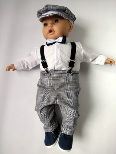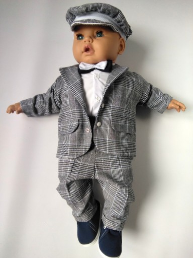 Niesamowity 6 - częściowy komplet do chrztu dla chłopca wykonany z miękkiego materiału w modnym szarym kolorze!!! Wzór w kratę nadaje charakteru całej stylizacji