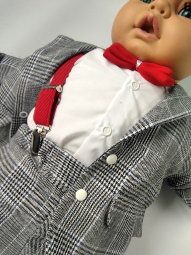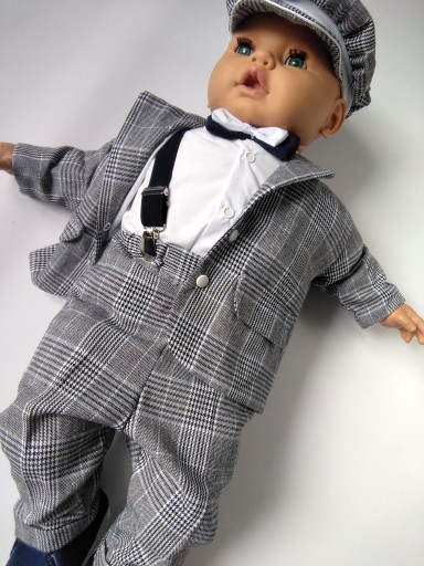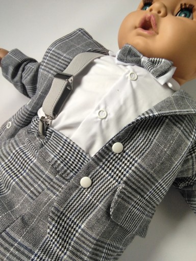 Niesamowity 6 - częściowy komplet do chrztu dla chłopca wykonany z miękkiego materiału w modnym szarym kolorze!!! Wzór w kratę nadaje charakteru całej stylizacji