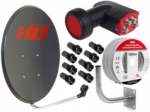 FULL ZESTAW HD: Czasza HD 80cm, Maszt 38cm, Konwerter Quad HD, Kabel antenowy 100m, Wtyki F!