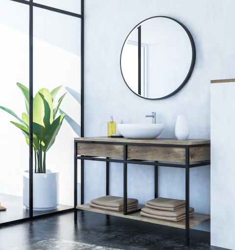 Lustro oprawione jest w solidną metalową ramę w kolorze czarnym matowym, wyposażoną w zawieszkę.