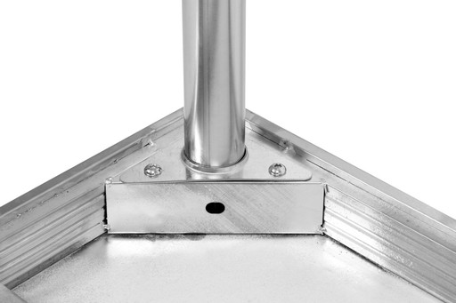 Blat stołu wykonany jest z masywnej blachy o grubości 0,8mm z dodatkowymi profilami wzmacniającymi. Dodatkowo blat wzmocniony jest od spodu drewnianą płytą laminowaną o grubości 20mm, która usztywnia go i wygłusza, a przy tym jest odporna na wilgoć. Dzięki temu blat może osiągnąć nośność wynoszącą do 150kg.