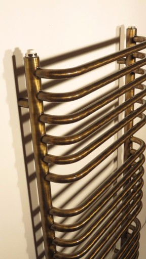 Grzejnik łazienkowy z zasilaniem dolnym w kolorze mosiądz antyczny.