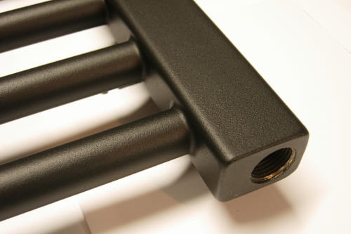 Grzejnik łazienkowy w kolorze czarny strukturalny z zasilaniem dolnym.