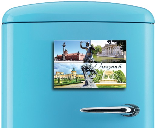Magnes na lodówkę z grafiką Warszawy tradycyjnej i nowoczesnej.