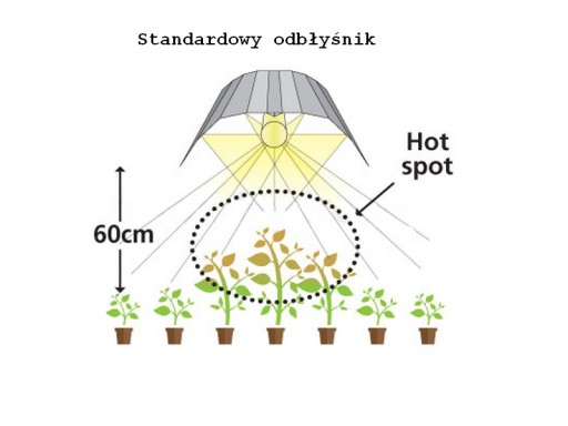 Nowy odbłyśnik WINGS A wykonany z blachy aluminiowej o gr. 0,8mm o wymiarach 120 x50 x H12cm umożliwia obniżenie, zawieszenia lampy nad roślinami o ok 40 % (nawet do 30cm ) przy zachowaniu równomiernej dystrybucji światła. Powierzchnia odbicia światła jest dwu krotnie większa niż standardowych odbłyśników i jednocześnie stopień odbicia światła od powierzchni lampy zwiększa się z 80 % do 95%. a ''SUPER SPREADER'' redukuje znacznie wydzielanie ciepła od lamp sodowych co pozwala wyeliminować wysoką temperaturę przy uprawę.