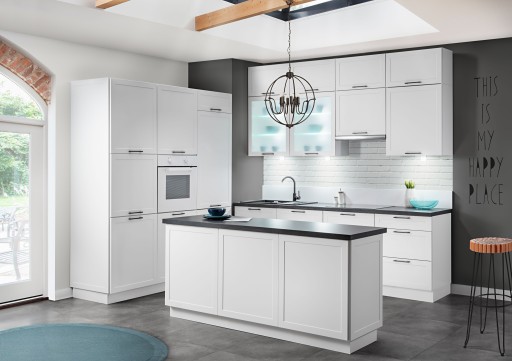 Zabudowa kuchenna, w której główną rolę grają szare matowe fronty nada każdemu wnętrzu ponadczasowy szyk i elegancję. Ważną rolę we froncie pełni subtelna ramka, dzięki której kuchnia zyskuje głębię odcieni. Przełamaniem monochromatycznej szarości stają się czarne uchwyty oraz elementy dekoru drewnianego w postaci blatu.