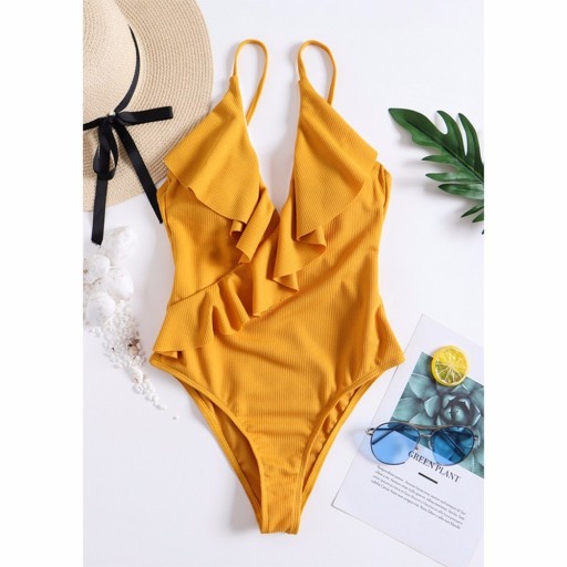 Jednoczęściowy kostium kąpielowy na cienkich regulowanych ramiączkach z ozdobną falbaną z przodu.
