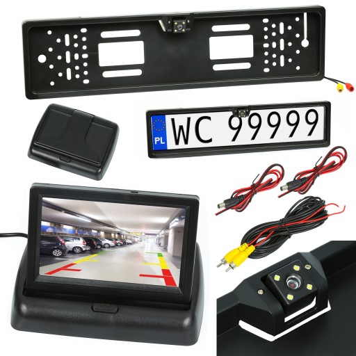 - Pasuje do każdego modelu samochodu z europejskimi tablicami i do dowolnego monitora z wejściem video RCA.