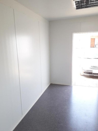 Podłoga: od spodu kontenera zabezpieczona blachą trapezową T-6 Alucynk o grubości 0,5mm Strona wewnetrzna wykonana z płyty OSB -18mm. Cała podłoga jest izolowana styropianem 80mm. Całość wykończona wykładziną przemysłową