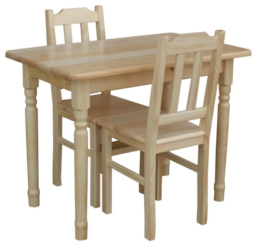Drewniany stół na toczonych nogach o wymiarach blatu 100 x 60 cm w kolorze jasnym, naturalnym.