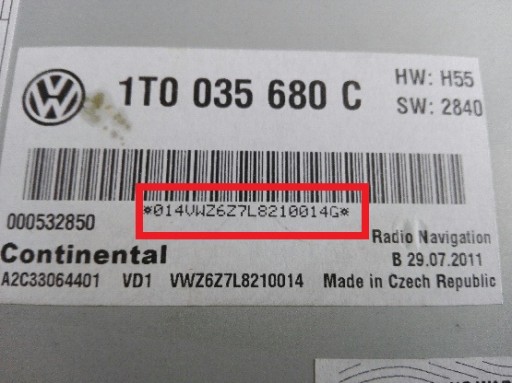 Numer seryjny radia rozpoczyna się od liter VWZ..., ciąg 14 znaków, znajduje się na obudowie radia, należy wyciągnąć radio i odczytać go z naklejki lub graweru na obudowie radia: