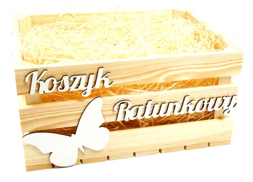 Drewniana skrzynka w naturalnym kolorze z białym napisem "Koszyk Ratunkowy" oraz motylkiem. Niezbędnik każdego Wesela, który z pewnością pomoże Waszym gościom przezwyciężyć kryzysowe sytuacje.