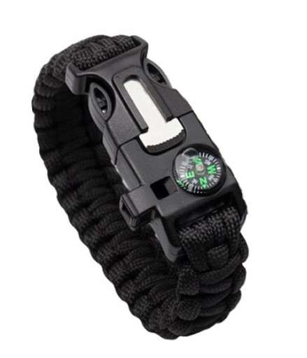 Survivalowa bransoletka, nie jest tylko ładnie zaprojektowanym i wykonanym gadżetem. Do jej wykonania użyto paracordu, po jego rozplątaniu mamy go spory zapas (około 3,6 metra), który możemy wykorzystać jako linkę do budowy schronienia, oplot do rękojeści noża, sznurowadła, itp. Oprócz klasycznego zastosowania, ten model został wyposażony w wielofunkcyjne zapięcie. W klamrze zostało umieszczone krzesiwo, gwizdek ratunkowy oraz blaszka, która może spełnić rolę małego ostrza. Na zewnętrznej stronie klamry znajduje się kompas.