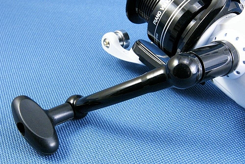 Rączka kołowrotka składana do transportu, zakończona poręcznym, plastikowym uchwytem.