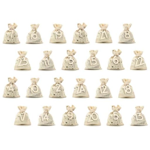 - Zestaw zawiera: 24 bawełniane woreczki, 24 sznurki oraz 24 numery