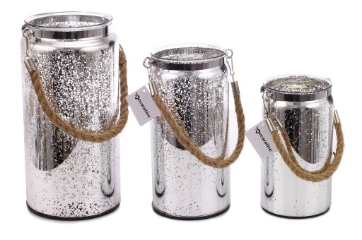Lampiony wykonane są ze szkła, którego wewnętrzna powierzchnia została pokryta przetartym lustrzanym chromem. U góry, chromowymi obejmami zamontowane są uchwyty wykonane z lnianego sznura, nadające im oryginalnej stylistyki.