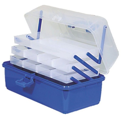 Uniwersalna skrzynka na akcesoria wędkarskie. Posiada trzypoziomowe półki z przegródkami na wszelkiego rodzaju dodatki, przydatne każdemu wędkarzowi. Ponadto posiada jedną dużą komorę na większe rzeczy.