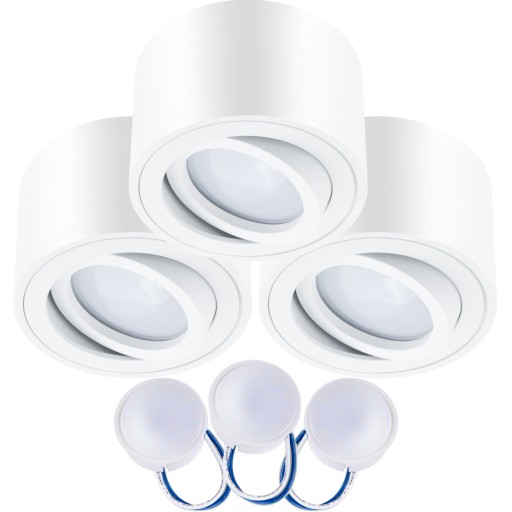 Komplet, zestaw trzech okrągłych opraw natynkowych w kolorze białym typu SPOT o wysokości 50 mm wraz z Żarówkami LED (wkładami) o mocy 5W marki LUMILED stanowią idealne połączenie innowacyjnego, nowoczesnego, a zarazem trwałego źródła światła.