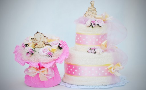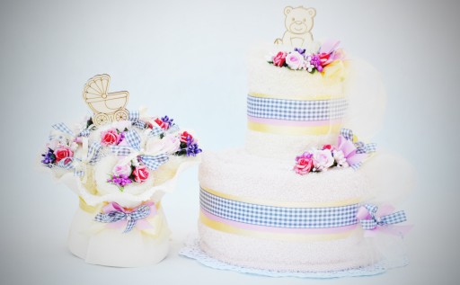 Ładny i praktyczny prezent na narodziny dziecka, chrzest, urodzinki - komplet ręczników: łazienkowy i kąpielowy w kształcie tortu z bogatą, kolorową dekoracją kwiatową oraz trzy ręczniki do rąk w kształcie bukietu.