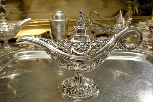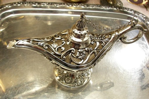Zapraszam do kupna pięknej, niewielkiej lampy Alladyna. Wykonana ze stopu cynku, pokryta srebrem. Przedmiot jest nowy , stylizowany na zabytkowy. Ładna rzecz, dobra cena .Dodajemy knot .Paliwem dla tej lampy jest olej do lamp , dostępny we wszystkich marketach, drogeriach, sklepach chemicznych , nawet w kwiaciarniach sprzedających lampy oliwne .To może być wspaniały pomysł na oryginalny prezent.