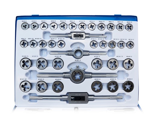 - 35 x 2szt. gwintowników: M2x0,4mm; M3x0,5mm; M4x0,7mm; M5x0,8mm; M6x0,75mm; M6x1,0mm; M7x0,75mm; M7x1,0mm; M8x0,75mm; M8x1,0mm; M8x1,25mm; M9x0,75mm; M9x1,0mm; M9x1,25mm; M10x0,75mm; M10x1,0mm; M10x1,25mm; M10x1,5mm; M11x0,75mm; M11x1,0mm; M11x1,25mm; M11x1,5mm; M12x0,75mm; M12x1,0mm; M12x1,25mm; M12x1,5mm; M12x1,75mm; M14x1,0mm; M14x1,25mm; M14x1,5mm; M14x2,0mm; M16x1,0mm; M16x1,5mm; M16x2,0mm; M18x1,5mm;