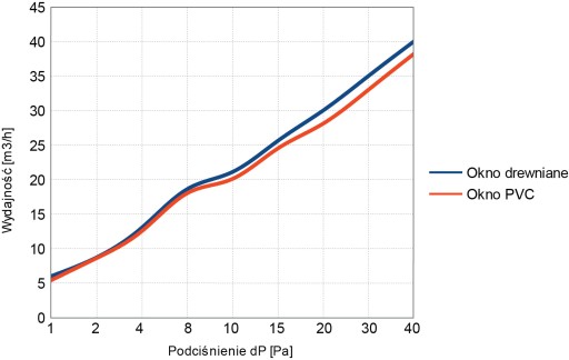 - Przy różnicy między ciśnieniem panującym na zewnątrz a wewnątrz budynku dP= 20 Pa wydajność wynosi 30 m³/h;