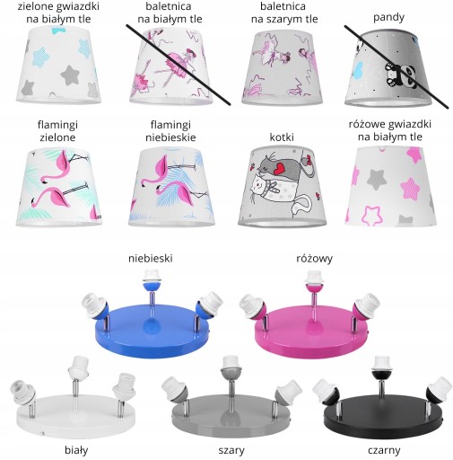 ✨ wzór abażura: zielone gwiazdki na białym tle, różowe gwiazdki na białym tle, baletnica na szarym tle, flamingi zielone, flamingi niebieskie, kotki