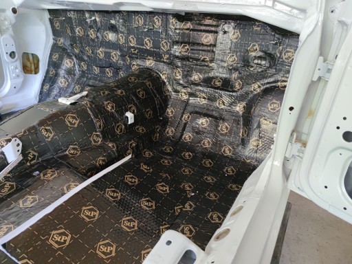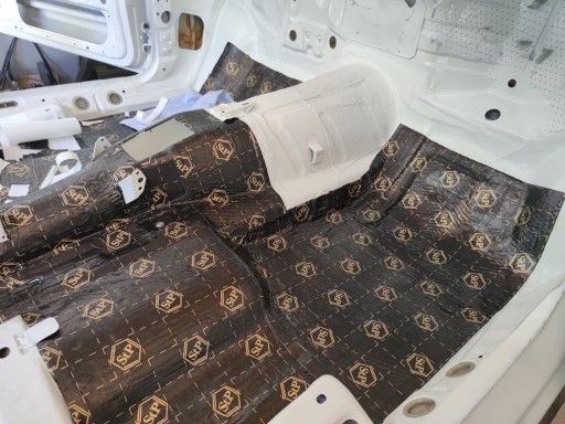 - Maty butylowe naklejamy na niedużą zakładkę. Omijamy miejsca montażowe na śruby, a wiązki elektryczne wyciągamy na zewnątrz.