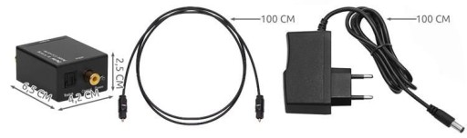 - SPECYFIKACJA – wejście optyczne CONVERTER: 2 RCA; optyczne wyjście Toslink/Coaxial: 2x RCA; wymiary konwertera (dł/szer/wys): 6,5/4,2/2,5cm; długość kabla optycznego: 100cm; długość zasilacza: 100cm; waga zestawu: 130g.