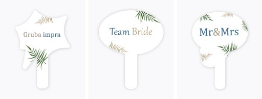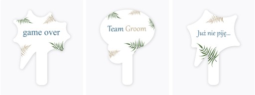 - Ilość: 15 sztuk tabliczek z gotowymi tekstami: lepsza połówka, kocham, najlepsze wesele ever, księżniczka, książę, wasze zdrowie, game over, team groom, już nie piję, omg, goodvibes, ona temu winna, gruba impra, team bride, mr&mrs