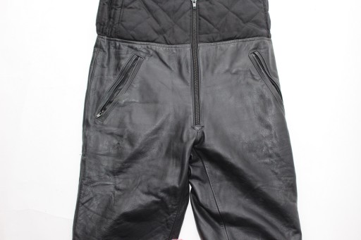 Skórzane spodnie, na regulowanych szelkach, wewnątrz siatka przeciwpotna, od pasa w góre wszyty materiał, 2 kieszonki, grubsze kolanka, zamek do dopicia kurtki, element odblaskowy, u dołu nogawek zamek- używane stan dobry- lekkie ryski, min dziurka poniżej kieszonki.