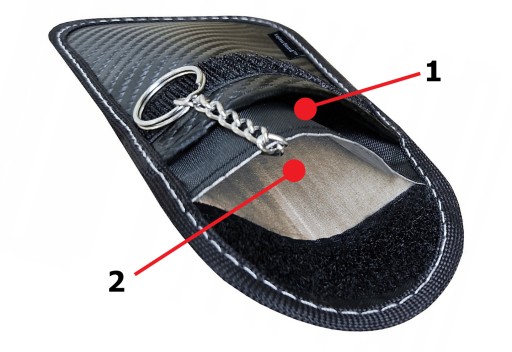 Tylko umieszczenie przedmiotu w kieszeni wyłożonej srebrno szarym materiałem (nr 2 na obrazku) chroni kluczyk oraz karty kredytowe. Druga kieszeń (nr 1 na obrazku) nie zapewnia ochrony, stanowi dodatkowe miejsce np. na prawo jazdy i drobiazgi.