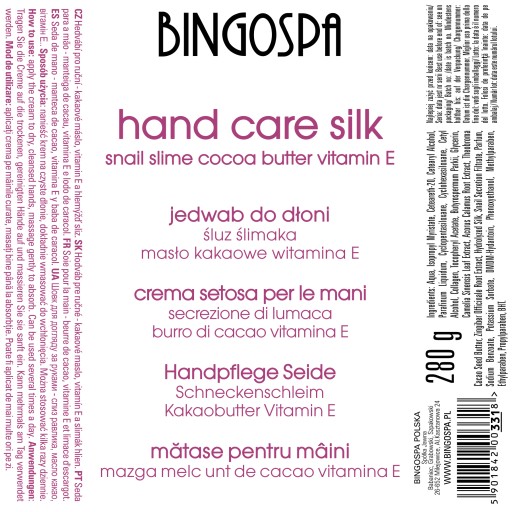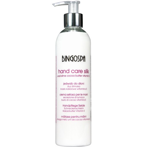 Jedwab BINGOSPA o lekkiej konsystencji do pielęgnacji rąk i paznokci. Polecany dla dłoni, które zasługują na troskliwą i skuteczną pielęgnację, dla Twoich dłoni. Skrupulatnie opracowana formuła BINGOSPA utrzymuje dłonie w doskonałej kondycji. Skuteczny kompleks regenerująco - odmładzający w skład którego wchodzą proteiny jedwabiu, śluz ślimaka, masło kakaowe oraz witamina E, stymuluje naturalne procesy odnowy, przywraca jędrność i elastyczność oraz opóźnia i niweluje oznaki starzenia się skóry.