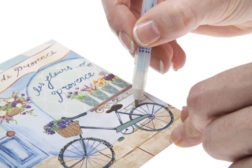 - Posługiwać się nim można jak zwykłym piórem kulkowym nanosząc klej punktowo, np. do mocowania akrylowych półkoralików, papierowych dekoracji lub kreśląc wzory o szerokości linii 0,6 mm.