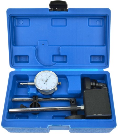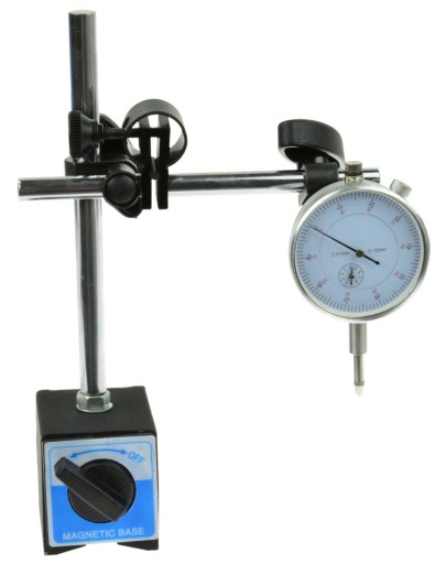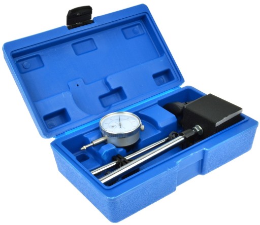 Precyzyjny czujnik zegarowy 0-10 mm o dokładności do 0,01 mm w zestawie z podstawą magnetyczną.