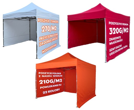 - Poszycie PVC PREMIUM: poliester powlekany PVC 320g/m2 o ponad dwukrotnie lepszych właściwościach technicznych od modelu standard. Namioty PVC PREMIUM wyglądają zawsze profesjonalnie. Szczególnie polecane do zastosowań reklamowych.