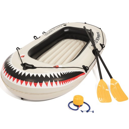 Liny stanowią ułatwienie przy wsiadaniu do pontonu. W razie uszkodzenia pontonu, producent dorzuca do zestawu łatkę naprawczą, dzięki której szybko i łatwo usuniesz usterkę. Całość uzupełnia ciekawa agresywna stylistyka na przedniej części przypominająca paszczę drapieżnej ryby
