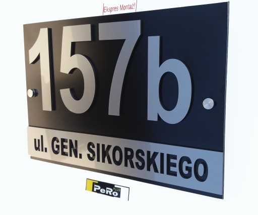 Tabliczka przestrzenna 3D z numerem domu oraz nazwą miejscowości lub ulicy;