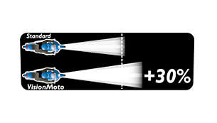 Zapewniające do 30% lepszą widoczność na drodze, żarówki Philips Vision Moto to doskonały wybór dla motocyklistów, którzy poszukują produktów oferujących wysoką wydajność i bezpieczeństwo. Większa moc strumienia świetlnego sprawia, że kierowcy motocykli mogą szybciej reagować na przeszkody i unikać wypadków.