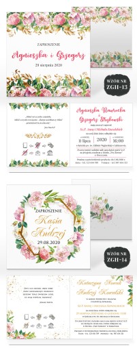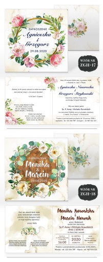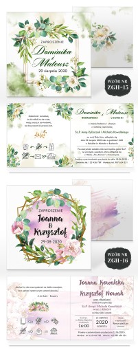 - Druk cyfrowy wybranego wzoru zaproszenia w formacie 140x280 mm (rozłożone), 140x140 mm (po złożeniu) wraz z kopertą.